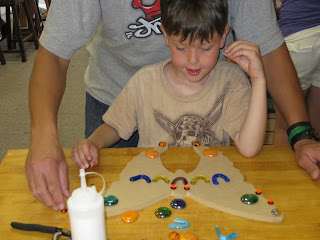 Not today though. Crazy thunderstorms all morning. They cleared by the afternoon, but sand doesn’t really dry all that quickly sometimes and I hate sitting in it. So instead, we went to a local craft place – the LBI Fun Factory. The top two pictures are from there. Lucy painted a ceramic goldfish a rather interesting color of brown, salmon, hot pink and green. We then added sparkles – whee! Connor made a mosaic butterfly – they had these great wood cutouts and a massive wall of beads and glass gewgaws. He and mr myn put it together and the place is going to grout it and fire it tonight and we’ll pick it up in the morning.